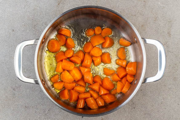 Die Karotten ggf. schälen und schräg in ca. 2cm breite Stücke schneiden, dann in einem großen Topf mit 4EL Pflanzenöl bei mittlerer bis starker Hitze ca. 5Min. anbraten. In einem zweiten großen Topf 900ml leicht gesalzenes Wasser für den Reis zum Kochen bringen.