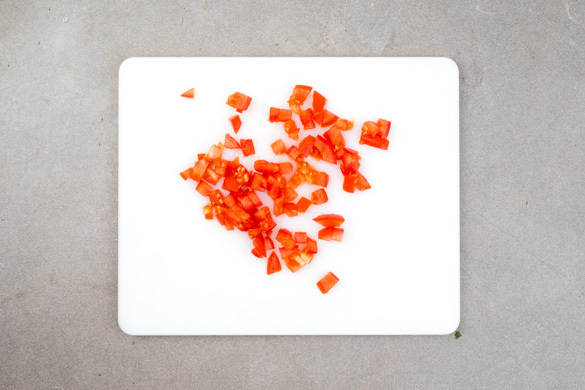 Die Tomaten in kleine Würfel schneiden, dabei den Strunk entfernen.