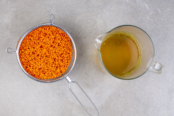 Die Linsen in einem Sieb mit lauwarmem Wasser abspülen. Das Brühgewürz in 1,5L heißem Wasser auflösen.