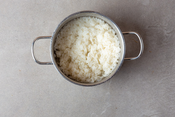 In einem mittelgroßen Topf 600ml leicht gesalzenes Wasser zum Kochen bringen. Den Reis in einem Sieb kalt abspülen, bis das Wasser klar bleibt. Sobald das Wasser kocht, den Reis hineingeben und abgedeckt bei niedrigster Hitze 12–14Min. kochen, bis das Wasser aufgesogen und der Reis gar ist. Noch ca. 5Min. ohne Hitzezufuhr ziehen lassen.