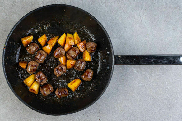 Die Apfelstücke und die Wurstscheiben in derselben Pfanne mit 1EL Olivenöl bei mittlerer Hitze 10–12Min. anbraten, bis die Wurst gar und schön gebräunt ist.