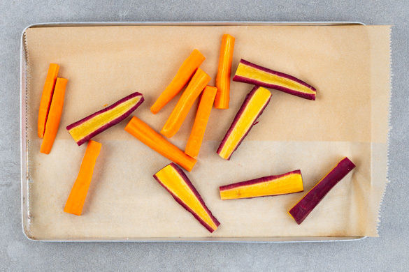 Die Karotten schälen und je nach Größe längs halbieren oder vierteln. Mit 1EL Olivenöl vermengen und auf einem mit Backpapier ausgelegten Backblech ca. 15Min. im Ofen rösten. Während der letzten 4–6Min. die 1/2 des Knoblauchs dazugeben und mitrösten.
