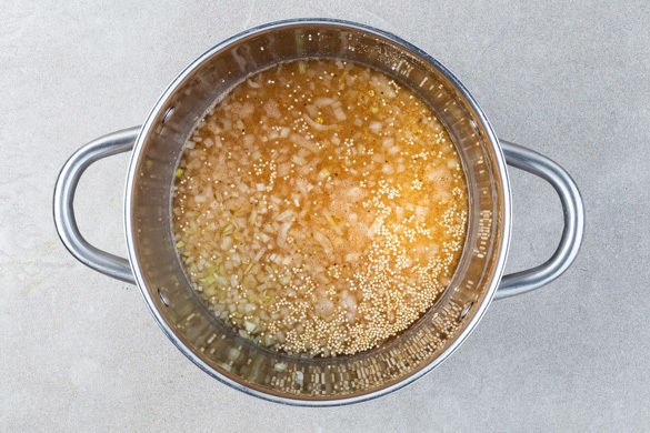 Die Quinoa in einem mittelgroßen Topf ohne Zugabe von Fett bei mittlerer Hitze vorsichtig 3–4Min. anrösten. Auf einem Teller beiseitestellen. Dann die 1/2 der Zwiebeln mit 1EL Butter 1–2Min. farblos anbraten. Mit 350ml Wasser ablöschen, die restliche Gewürzmischung und die Quinoa unterrühren und die Quinoa bei niedriger Hitze abgedeckt 10–12Min. sanft köcheln lassen.