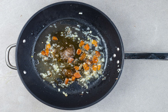 Die restlichen Zwiebeln und die getrockneten Aprikosen in der Pfanne mit 1EL Olivenöl bei mittlerer Hitze 1–2Min. farblos anbraten. Mit der 1/2 des Zitronensafts ablöschen und die Aprikosenkonfitüre unterrühren. Mit Salz und Pfeffer abschmecken.