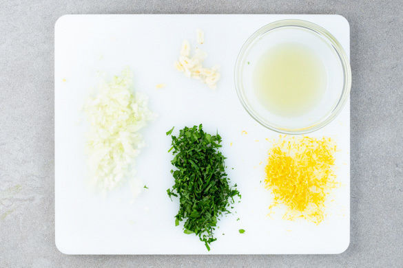 Den Backofen auf 220°C Umluft (240°C Ober-/Unterhitze) vorheizen. Die Zwiebel schälen, halbieren und in feine Würfel schneiden. Den Knoblauch schälen und in feine Scheibchen schneiden. Die Petersilie samt Stängeln fein hacken. Die Zitronenschale abreiben, dann die Zitrone halbieren und auspressen.
