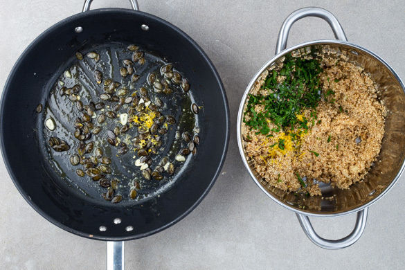 Die Quinoa in einem mittelgroßen Topf ohne Zugabe von Fett bei mittlerer Hitze vorsichtig 3–4Min. anrösten. Auf einem Teller beiseitestellen. Dann die 1/2 der Zwiebeln mit 2EL Butter 1–2Min. farblos anbraten. Mit 700ml Wasser ablöschen, die restliche Gewürzmischung und die Quinoa unterrühren und die Quinoa bei niedriger Hitze abgedeckt 10–12Min. sanft köcheln lassen.