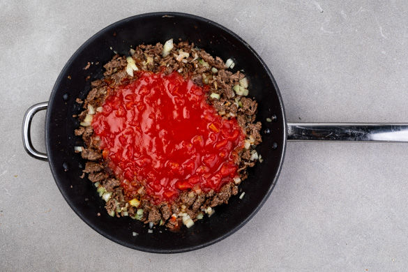 Die Zwiebeln und den Knoblauch zum Fleisch geben und bei mittlerer Hitze 1–2Min. mitbraten. Das Tomatenmark unterrühren, mit den gehackten Tomaten ablöschen und die Sauce ca. 10Min. bei niedriger Hitze sanft köcheln lassen, dabei etwas Pastawasser hinzugeben, falls sie zu stark eindickt. Mit der Worcestershiresauce sowie Salz und Pfeffer abschmecken.