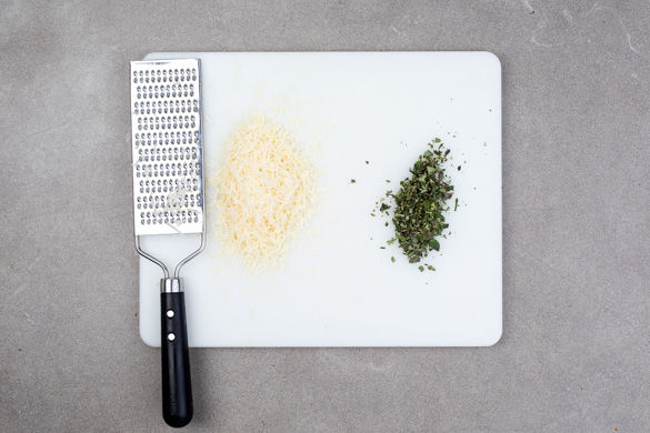Den Käse fein reiben. Die Oreganoblättchen von den Stängeln zupfen und fein schneiden.