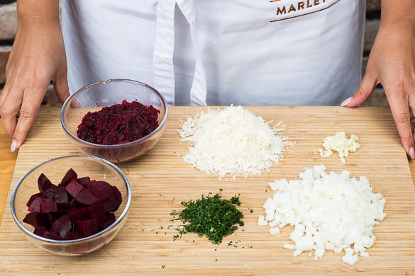 Die Roten Beten abtropfen lassen. Die ½ der Roten Beten in 1–2cm große Stücke schneiden, die übrigen Beten fein reiben. Die Zwiebel schälen, halbieren und in feine Würfel schneiden. Den Knoblauch schälen und ebenfalls fein würfeln. Den Dill samt Stängeln fein schneiden. Den Käse fein reiben.