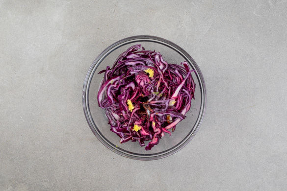 Den Rotkohl halbieren und in feine Streifen schneiden, dabei den Strunk entfernen. In eine Schüssel geben und mit dem Limettensaft und der 1/2 des Limettenabriebs vermengen. Die 1/2 der Teriyakisauce, 1–2EL Pflanzenöl und Ingwer nach Geschmack zugeben, mit 1–2 Prisen Zucker und Salz würzen und alles mit den Händen gut verkneten. Den Salat mit Essig abschmecken.