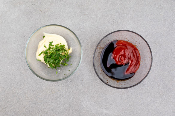 Die restliche Teriyakisauce mit dem Ketchup verrühren. Die Mayonnaise mit dem restlichen Koriander verrühren. Die Brötchen 2–3Min. im Ofen aufknuspern.