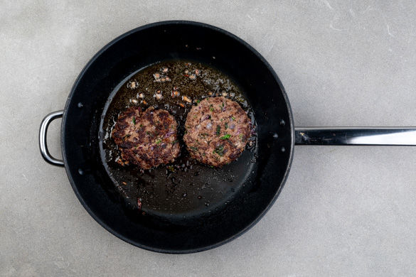 Die Pattys in einer mittelgroßen Pfanne mit 1–2EL Pflanzenöl bei mittlerer Hitze auf jeder Seite 2–3Min. knusprig anbraten. Die Brötchen aufschneiden, mit der Mayo und dem Teriyaki-Ketchup bestreichen und mit dem Fleisch, den Gurken und den Zwiebelstreifen belegen. Die Burger mit dem Rotkohlsalat servieren.