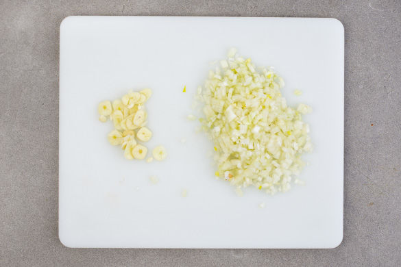 Die Zwiebeln schälen und in feine Würfel schneiden. Den Knoblauch schälen und ebenfalls fein würfeln.