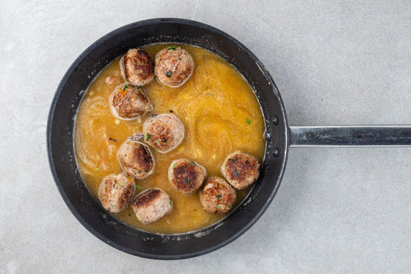 2EL Mehl in die Pfanne geben und gut mit dem Bratensatz verrühren. Dann den Ketchup und das Brühgewürz dazugeben, die Hackbällchen samt ausgetretenen Bratensaft in die Pfanne legen und ca. 600ml Wasser angießen. Die Sauce 3–4Min. bei mittlerer Hitze sanft köcheln lassen.