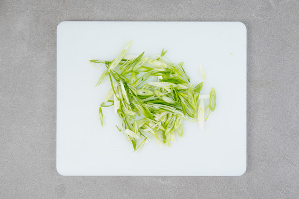 Die Lauchzwiebeln schräg in längliche, feine Ringe schneiden.