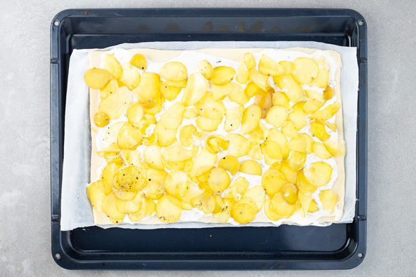 Den Teig mit dem Papier nach unten auf einem Backblech ausrollen und mit der Ziegenkäsecreme bestreichen. Die Kartoffeln darauf verteilen und die Pizza ca. 12Min. im Ofen backen.