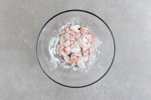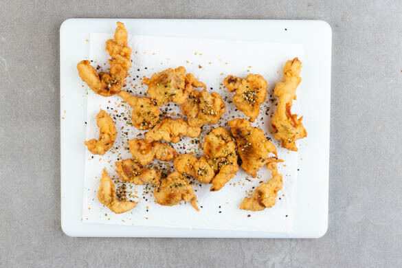 Das Fleisch durch den Teig ziehen, bis es gleichmäßig bedeckt ist. Eine mittelgroße Pfanne ca. 1cm hoch mit Pflanzenöl befüllen und stark erhitzen. Das Fleisch bei starker Hitze 2–3Min. von jeder Seite frittieren, ggf. portionsweise arbeiten. Das Fleisch auf etwas Küchenkrepp abtropfen lassen und das noch heiße Fleisch mit der Gewürzmischung vermengen.