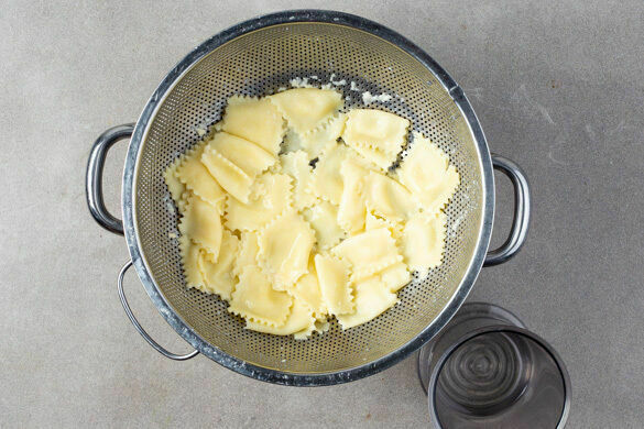 Die Tortelli in das kochende Wasser geben und in 4–5Min. bissfest kochen. Ca. 200ml Pastawasser abschöpfen, dann die Tortelli in ein Sieb abgießen.