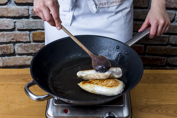 Das Fleisch in eine kleine Auflaufform geben und von beiden Seiten mit etwas Teriyaki-Honig-Glasur bestreichen. Anschließend im Ofen 8–10Min. garen, dabei das Fleisch regelmäßig mit der Glasur bestreichen, bis alles aufgebraucht ist.