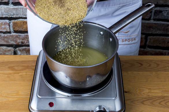Den Backofen auf 200°C (180°C Umluft) vorheizen. In einem kleinen Topf 300ml Wasser zum Kochen bringen. Den Bulgur mit der ½ des Brühgewürzes in das kochende Wasser rühren und abgedeckt bei niedriger Hitze 5–7Min. sanft köcheln lassen, bis das Wasser aufgesaugt und der Bulgur gar ist. Noch ca. 5Min. ohne Hitzezufuhr ziehen lassen.
