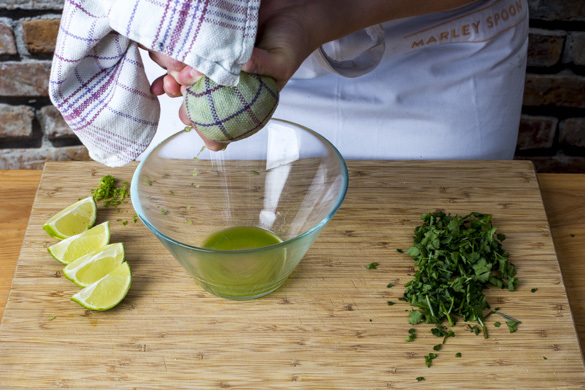 Inzwischen die Gurke mit einer Küchenreibe grob raspeln und mithilfe eines Küchentuchs gut auswringen. Die Limettenschale fein abreiben, dann die Limette in Spalten schneiden. Den Koriander samt Stängeln grob schneiden.