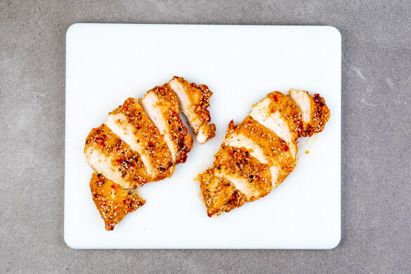 Das Fleisch in einer großen Pfanne mit 1EL Pflanzenöl bei mittlerer Hitze auf jeder Seite 2–3Min. goldbraun anbraten. Dann mit der Sweet-Chili-Sauce bestreichen und mit dem Sesam bestreuen und noch weitere 1–2Min. garen, bis das Fleisch durch ist. Auf einem Teller beiseitestellen. Die Pfanne nicht auswischen.