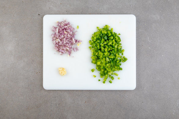 Die Paprika vierteln, entkernen und in ca. 0,5cm kleine Würfel schneiden. Die Zwiebel schälen, halbieren und in feine Würfel schneiden. Den Knoblauch schälen und ebenfalls fein würfeln.