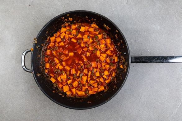 Das Gemüse mit den passierten Tomaten und 100–150ml Wasser ablöschen und einmal aufkochen lassen. Dann die Hitze auf niedrige Stufe reduzieren und das Gemüse mit der Gewürzmischung nach Geschmack verfeinern. Den Knoblauch hinzugeben und alles 10–15Min. sanft köcheln lassen, bis das Wasser verdampft ist. Ggf. etwas mehr Wasser verwenden, damit die Kartoffeln gar werden.