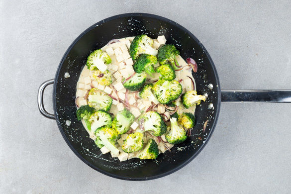 Die 1/2 der Zwiebeln in einer großen Pfanne mit 1EL Olivenöl und 1 1/2 Päckchen Gewürzmischung bei mittlerer Hitze ca. 1Min. anbraten. Den Brokkoli und den Tofu dazugeben und 1–2Min. mitbraten, dann mit der Kokosmilch ablöschen. Mit Salz würzen und das Curry abgedeckt bei mittlerer Hitze 9–10Min. köcheln lassen.