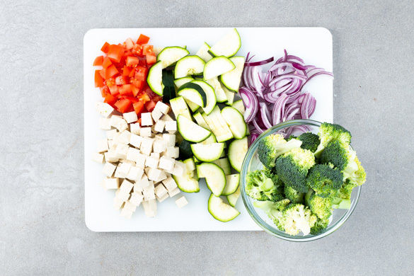 Den Brokkoli in mundgerechte Röschen schneiden, den Strunk schälen und in Würfel schneiden. Die Zucchini längs halbieren und in ca. 1cm dicke Scheiben schneiden. Die Tomate halbieren und in ca. 1cm große Würfel schneiden. Die Zwiebel schälen, halbieren und in feine Streifen schneiden. Den Tofu in kleine Würfel schneiden.