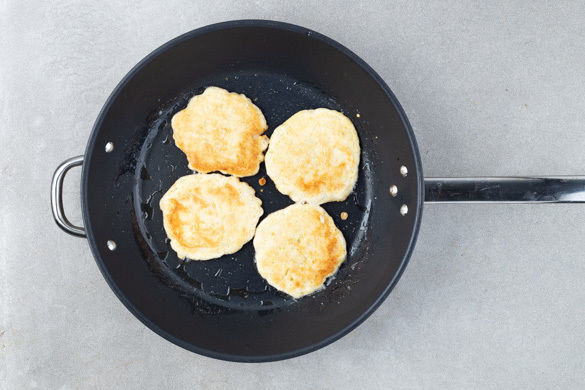 Den restlichen Reis mit 4EL Mehl, der restlichen Gewürzmischung, 2 Prisen Salz und 4 verquirlten Eiern vermengen. Eine große Pfanne mit 1EL Olivenöl bei mittlerer Hitze erwärmen. Aus je 2EL Reismasse kleine Pfannkuchen formen und von jeder Seite 2–3Min. anbraten. Das restliche Curry mit 3–4EL Wasser in einem kleinen Topf erwärmen und mit den Reispfannkuchen servieren.