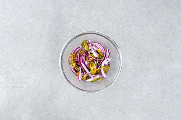 Die Peperoni in dünne Ringe schneiden. Tipp: Für weniger Schärfe die Kerne entfernen. Die Peperoniringe mit den restlichen Zwiebeln, je 1 Prise Zucker und Salz sowie 1EL Essig vermengen.