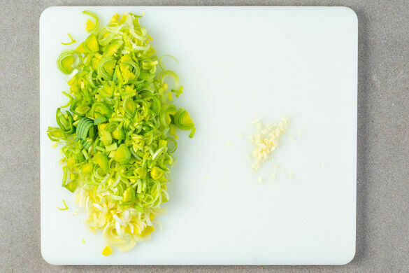 In einem großen Topf ausreichend gesalzenes Wasser für die Tortelli zum Kochen bringen. Den Lauch längs halbieren und quer in dünne Streifen schneiden. Den Knoblauch schälen und fein würfeln.