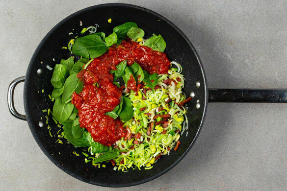 Die ½ des Spinats und die Tomatensauce mit in die Pfanne geben. Unter Rühren aufkochen lassen, bis der Spinat zusammenfällt.