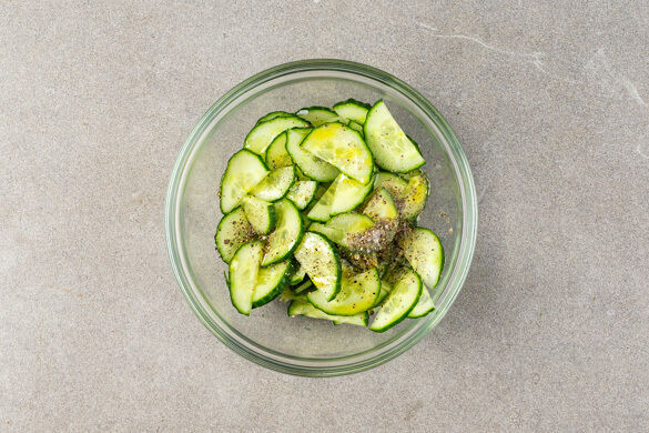 Die Gurke längs halbieren und quer in dünne Scheiben schneiden. Je 2TL Pflanzenöl und Essig mit je 1 Prise Zucker und Salz und 1 kräftigen Prise Pfeffer zu einem Dressing verrühren und die Gurken untermengen.