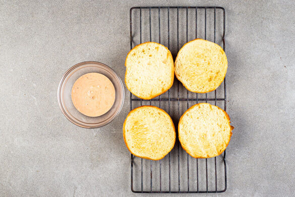 Die Brötchen aufschneiden und 2–3Min. im Ofen aufbacken. Inzwischen 2EL Mayonnaise mit 2EL Ketchup und 1 Prise Pfeffer zu einer Sauce vermengen. Den Spinat gründlich waschen.