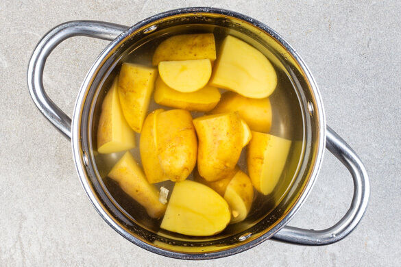 Den Backofen auf 180°C (160°C Umluft) vorheizen. In einem mittelgroßen Topf ausreichend gesalzenes Wasser für die Kartoffeln zum Kochen bringen. Die Kartoffeln samt Schale je nach Größe halbieren oder vierteln, dann in das kochende Wasser geben und in 15–20Min. gar kochen. Die Kartoffeln anschließend in ein Sieb abgießen.