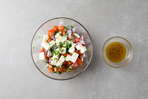 2EL Olivenöl und 1EL Essig mit der aufbewahrten Gewürzmischung zu einem Dressing verrühren. Die Zwiebeln, die Gurken, die Tomaten, den Feta und die Petersilie mit dem Dressing vermengen und den Salat mit Salz und Pfeffer abschmecken.