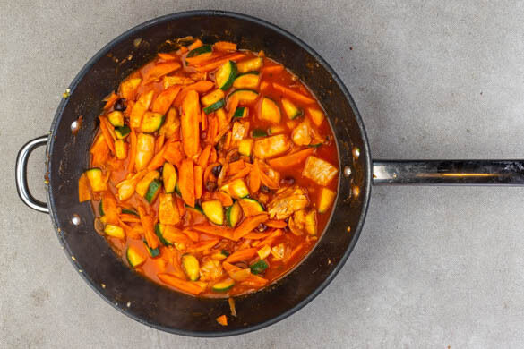 Die Karotten mit 1EL Olivenöl in einer mittelgroßen Pfanne bei mittlerer Hitze 2–3Min. anbraten, dann die Zucchini zugeben und 2–3Min. mitbraten, bis das Gemüse anfängt weich zu werden. Die Zwiebeln, den Knoblauch und die Oliven zugeben und 2–3Min. mitbraten, bis die Zwiebeln glasig sind.
