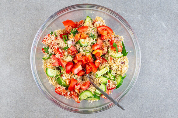 Den Couscous mit einer Gabel auflockern, dann die Zwiebeln und die Petersilie untermengen und mit Salz und Pfeffer abschmecken.