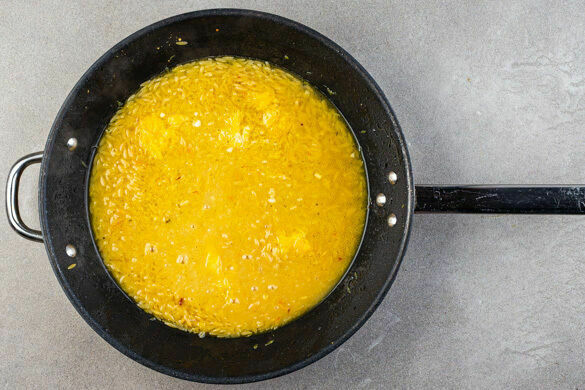 Die Pasta in der Pfanne unter ständigem Rühren ca. 1Min. glasig anschwitzen. Mit 800ml Wasser ablöschen, mit je 1 kräftigen Prise Salz und Pfeffer würzen und 12–14Min. köcheln lassen, bis die Pasta bissfest und die Flüssigkeit größtenteils verdampft ist. Vom Herd nehmen und etwas abkühlen lassen.