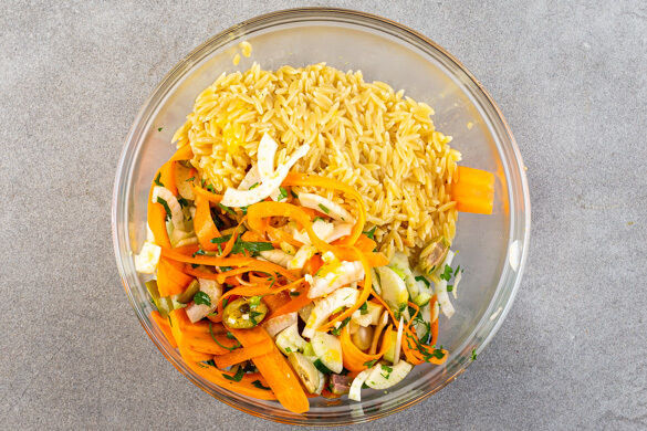 Im Herzen haben wir Italien ja wahrscheinlich alle, heute holen wir es mal wieder in seiner schönsten Form auf den Teller: Es gibt frisch-fruchtig mit Orange verfeinertes Hähnchenschenkelfilet auf einem bunten Salat aus Fenchel, Karotten, Petersilie und Risoni-Pasta. Für würzige Momente sorgen Oliven und kräftiger Käse. Praktischerweise ist alles in Nullkommanix zubereitet und schmeckt sicher Alt und Jung und allen dazwischen!