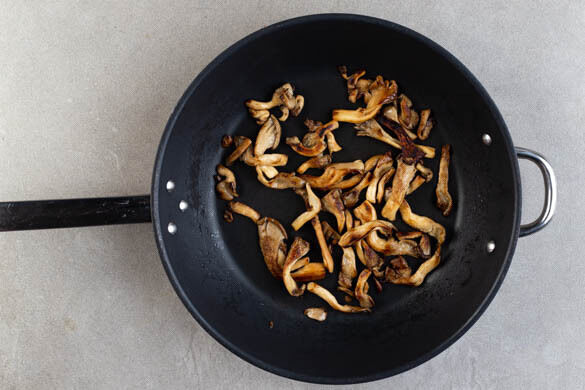 Den Backofen auf 240°C (220°C Umluft) vorheizen. Die Austernpilze in dünne Streifen zupfen. In einer großen Pfanne mit 1EL Olivenöl bei starker Hitze in 8–10Min. goldbraun und knusprig braten, dabei gelegentlich wenden. Nebenher den Käse fein reiben.