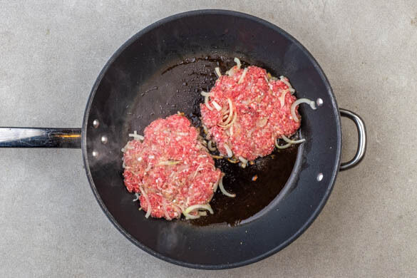 Die Zwiebeln schälen, halbieren und in feine Streifen schneiden. Das Hackfleisch mit je ½TL Salz und Pfeffer würzen, mit den Zwiebeln vermengen und zu 4 großen Fleischbällchen formen. Auf Backpapier legen und mit einer weiteren Lage Backpapier abdecken, dann mit einem Topf oder einer Pfanne die Fleischbällchen zu dünnen Pattys klopfen.