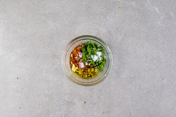 Die Limettenschale abreiben, dann die Limette halbieren und auspressen. Die Chilischote längs halbieren, ggf. für weniger Schärfe entkernen und in möglichst feine Streifen schneiden. Den Koriander samt Stängeln fein schneiden.