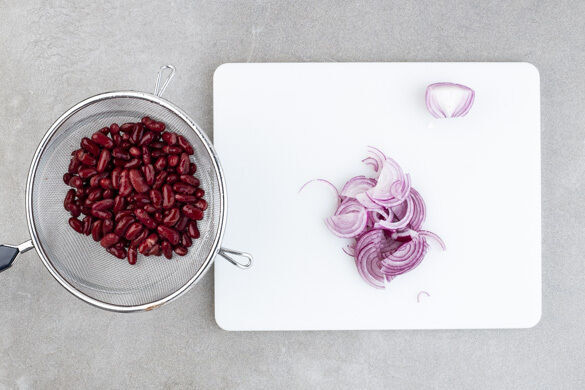 Die Bohnen in einem Sieb mit kaltem Wasser abspülen und abtropfen lassen. Die Zwiebel schälen, vierteln und drei Zwiebelviertel in dünne Streifen schneiden.