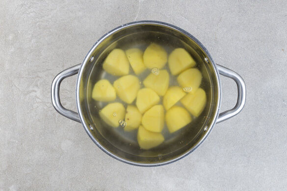 Die Kartoffeln schälen und je nach Größe halbieren oder vierteln, dann in das kochende Wasser geben und in 15–20Min. gar kochen. Tipp: Die Kartoffeln sind durch, wenn sie sich bei der Messerprobe leicht vom Messer lösen. Mit einer Tasse etwas Kochwasser abschöpfen, dann die Kartoffeln in ein Sieb abgießen.