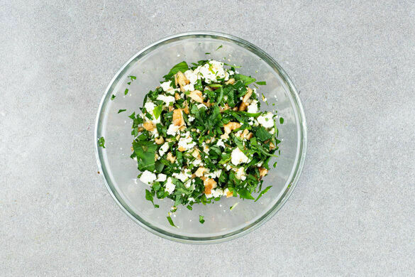 Die Petersilienblätter abzupfen und grob hacken, die Petersilienstängel fein schneiden. Den Feta mit den Fingern oder einer Gabel zerkrümeln, dann mit den Kräutern und den Walnüssen vermengen. Die Suppe auf tiefe Teller oder Schalen verteilen, jeweils 3–4 Hackbällchen darauf anrichten und mit der Gremolata garniert servieren.