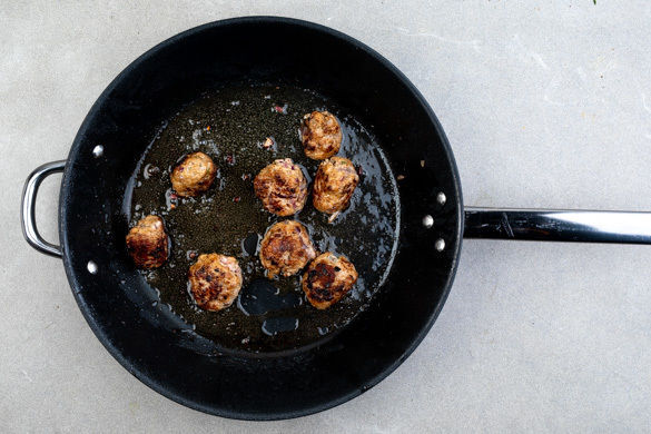 Die Hackbällchen in einer großen Pfanne mit 2EL Olivenöl bei mittlerer Hitze 4–5Min. rundum anbraten. Die Pfanne vom Herd nehmen und die Hackbällchen in der Pfanne ruhen lassen.