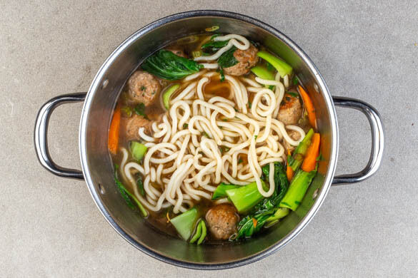 Beim Duft dieser köstlichen Suppe wird uns sofort warm ums Herz. Feine Hackbällchen, gewürzt mit Knoblauch und Koriander, dürfen zusammen mit knackiger Karotte und Sellerie in einer würzigen Brühe ziehen, die mit Hoisin- und Fischsauce zu einem aromatischen Hochgenuss verfeinert wurde. Zum Schluss gesellen sich noch frische Udonnudeln und knackiger Pak Choi dazu. Und noch einen Pluspunkt gibt es: Es fällt kaum Abwasch an!